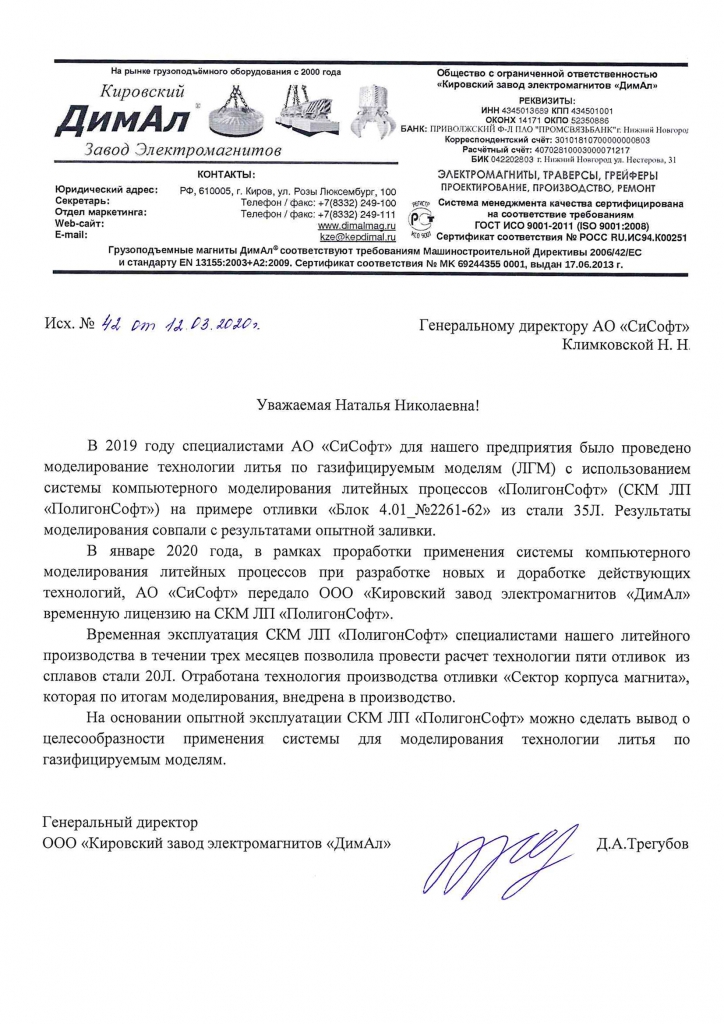 «На основании опытной эксплуатации можно сделать вывод о целесообразности применения системы «ПолигонСофт» для моделирования технологии литья по газифицируемым моделям», — подчеркнул генеральный директор ООО «Кировский завод электромагнитов «ДимАл» Дмитрий Трегубов.