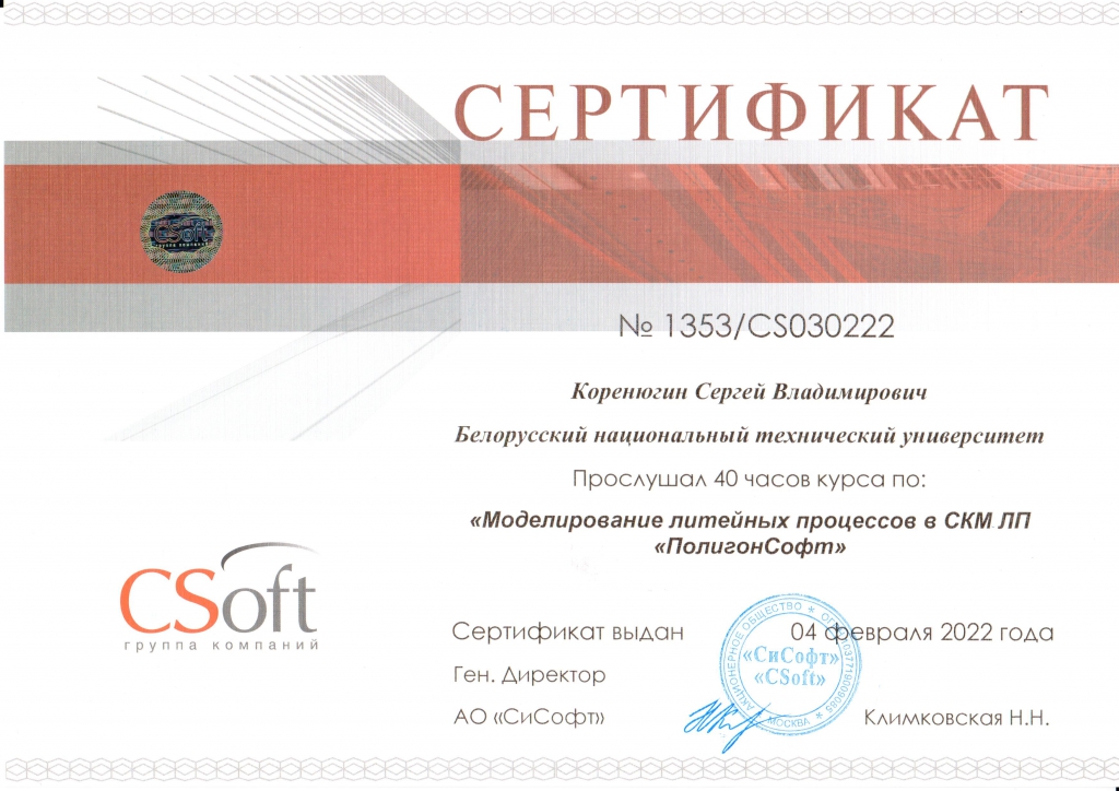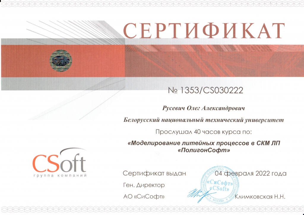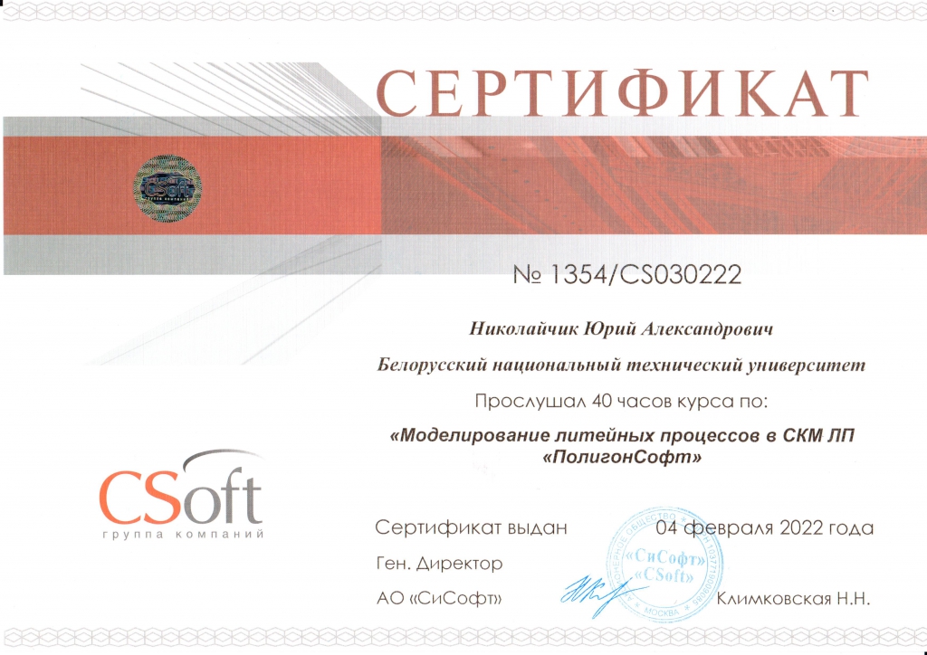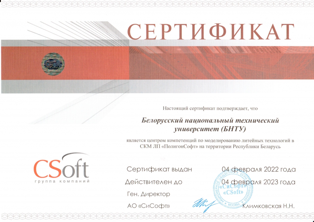 В ноябре 2021 года на 29-й Международной научно-технической конференции «Литейное производство и металлургия – 2021. Беларусь» в Минске между заместителем начальника отдела машиностроения ГК «СиСофт» (CSoft) Алексеем Монастырским и проректором БНТУ по научной работе Юрием Николайчиком была достигнута договоренность о том, что после обновления СКМ ЛП «ПолигонСофт» специалисты БНТУ смогут пройти бесплатное обучение работе в этом ПО. А после сдачи ими квалификационного экзамена университет получит сертификат о получении статуса Центра компетенций на территории Республики Беларусь в области моделирования литейных технологий в СКМ ЛП «ПолигонСофт». Несмотря на пандемию, эти планы удалось воплотить в жизнь.