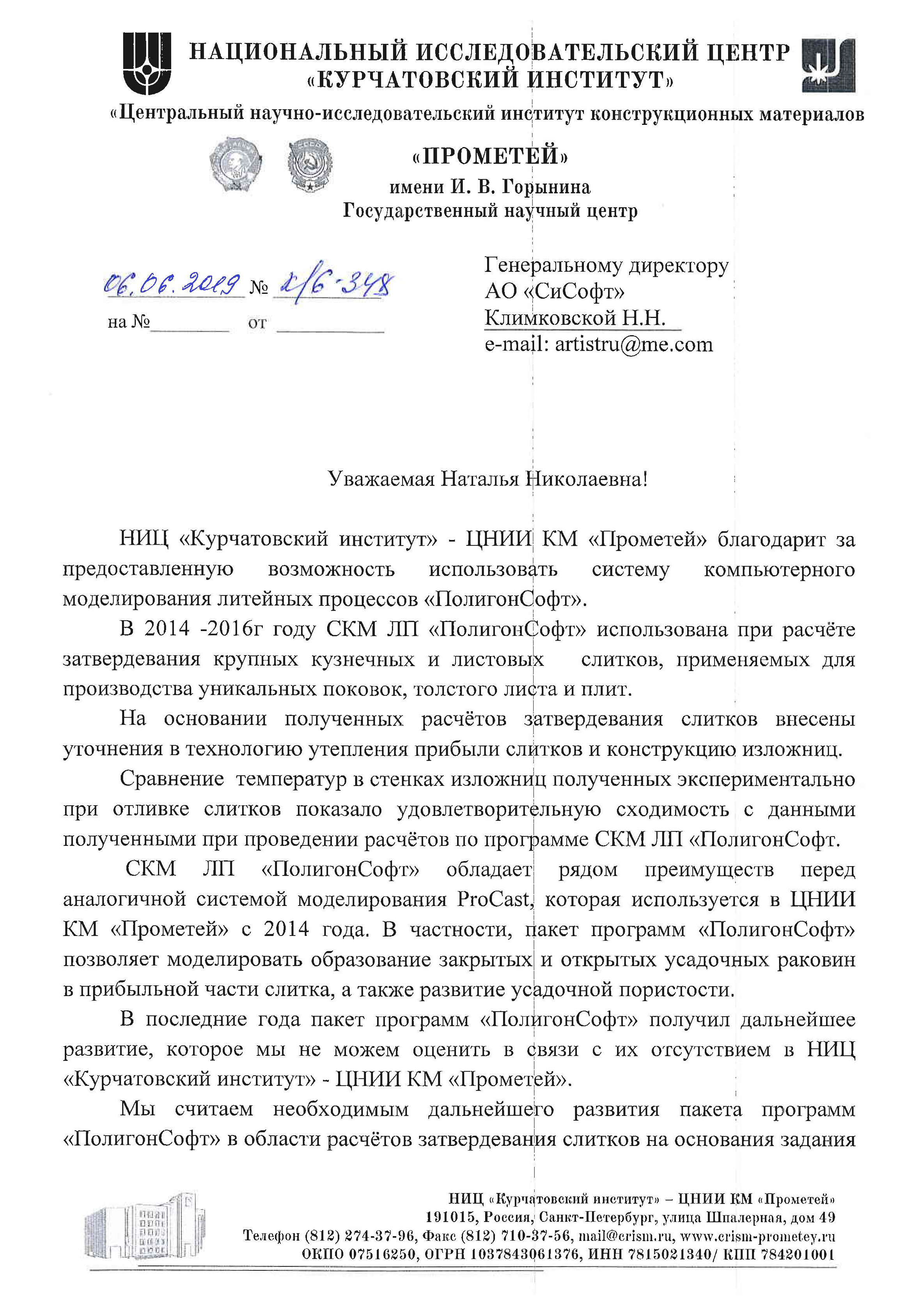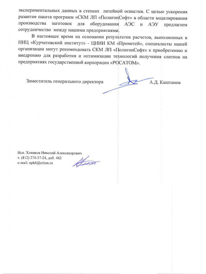 «На наш взгляд, «ПолигонСофт» обладает целым рядом преимуществ перед аналогичными системами моделирования, — подчеркнул заместитель генерального директора НИИ «Прометей» Александр Дмитриевич Каштанов. — В частности, пакет программ «ПолигонСофт» позволяет моделировать образование закрытых и открытых усадочных раковин в прибыльной части слитка, а также развитие усадочной пористости. Специалисты нашей компании могут рекомендовать «ПолигонСофт» к приобретению и внедрению для разработки и оптимизации технологий получения слитков на предприятиях Государственной корпорации «Росатом»».