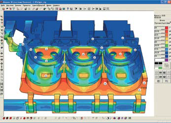 Рассчитывается падение температуры расплава при контакте со стенками формы и теплоотдаче в среду, а также выделение твердой фазы, которое может привести к остановке течения и непроливу. Специальный алгоритм позволяет исследовать работу литниковой системы, выявить ее